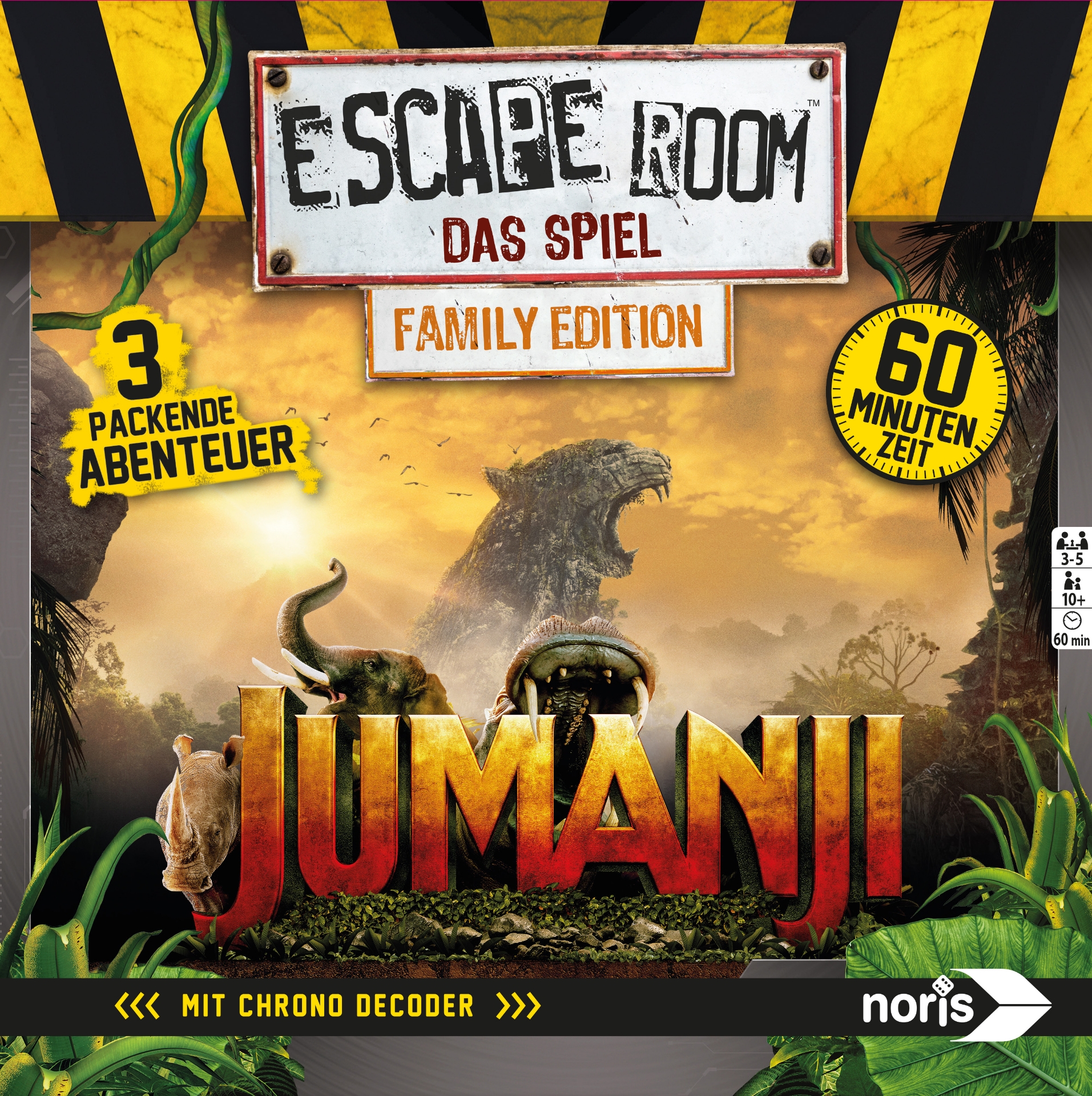 Ihr geht dem Geräusch nach und findet eine alte Spielekonsole…und wenig später seid ihr plötzlich mitten im Dschungel. Jumanji hat begonnen! Bei Escape Room – Jumanji spielt ihr gemeinsam, und versucht Jesse zu finden und die Geheimnisse der Insel zu lüften. In den drei aufeinander aufbauenden Abenteuern lernt ihr immer mehr über die Insel. Denn bei diesem Spiel spielt ihr gemeinsam und versucht Rätsel zu lösen und versteckte Hinweise zu finden. Dafür habt ihr aber nur 60 Minuten Zeit - Adrenalin pur! In diesem Rennen gegen die Zeit ist der Chrono Decoder euer Spielleiter. Er zählt die Minuten erbarmungslos runter und wird euch wissen lassen, wenn die Zeit knapp wird! Bei diesem Spiel gewinnt oder verliert ihr zusammen. Jeder Spieler muss sein Bestes tun, um das gemeinsame Ziel zu erreichen. Doch nur mit Teamwork könnt ihr es schaffen! Diese Escape Room Family Edition kann auch schon mit Kindern ab 10 Jahren gespielt werden!