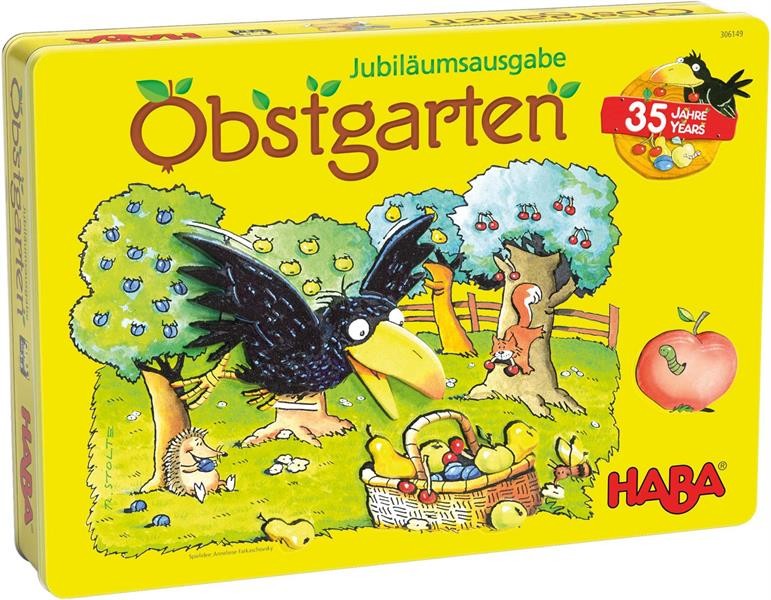 Doch die will ein anderer stibitzen: Rabe Theo ist schon im Landeanflug! Jetzt brauchen die Spieler etwas Würfelglück. Gemeinsam versuchen sie, die Früchte zu ernten, bevor der freche Rabe den Obstgarten erreicht. Das stärkt das Wir-Gefühl! Weil es den beliebten HABA Klassiker Obstgarten nun schon seit 35 Jahren gibt, ist er als Jubiläumsausgabe in einer limitierten Auflage in einer hochwertigen Metalldose erhältlich. Kinder haben mit der Jubiläumsausgabe nicht nur großen Spielspaß, sondern trainieren auch das Erkennen und Zuordnen von Farben.