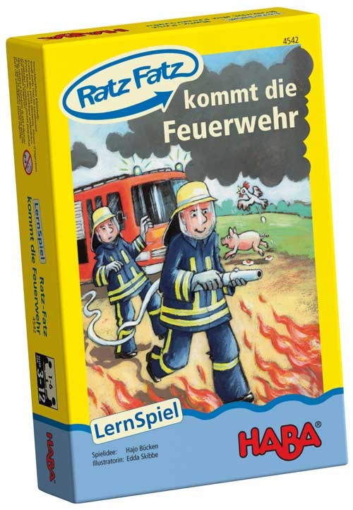 In Ratz Fatz kommt die Feuerwehr, dem beliebten HABA-Lernspiel im Kleinformat, dreht sich alles um das Thema Feuerwehr. Es gibt eine Geschichte, ein Rätsel, ein Gedicht und auch ein kleines Würfelspiel. Was biegt mit Blaulicht und Sirene um die Ecke? Womit löscht die Feuerwehr ein Feuer? Während eine Geschichte, ein Gedicht oder ein Rätsel vorgelesen wird, heißt es: aufgepasst! Wird ein Gegenstand, der auf dem Tisch liegt, genannt oder im Rätsel gesucht, sollen die Kinder schnell zufassen! Mit den Spielkarten lassen sich auch ganz leicht eigene Geschichten, Rätsel und Gedichte erfinden und erzählen.