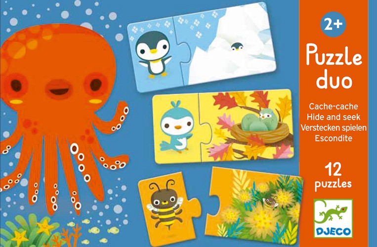 Mit dem Duo Puzzle Verstecken spielen ist genaues Schauen und Kombinieren gefragt. Welches Tier versteckt sich wo? Wer die richtigen Teile zusammenfügt, erhält am Ende 12 kleine Puzzles.