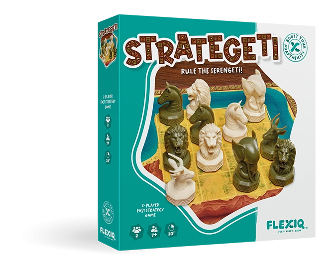 Jeder Spieler hat 2 Elefanten, 2 Löwen, 2 Gazellen und 2 Zebras. Versuchen Sie, die Serengeti zu beherrschen, indem Sie Ihre Tiere geschickt auf dem Spielbrett platzieren und bewegen! Um zu gewinnen, musst du 4 deiner Tiere in einer horizontalen, vertikalen oder diagonalen Linie platzieren, 5 Tiere deines Gegners eliminieren oder deinen Gegner an der Bewegung hindern.Vorausschauendes Denken und Anpassungsfähigkeit sind gefragt, denn jedes Tier bewegt sich anders und hat seine eigenen Stärken und Schwächen ... und ein kluger Zug kann alles verändern!Strategeti ist eine Mischung aus Connect 4 und Schach mit Tieren, mit wunderschönen 3D-Spielfiguren und einem realistischen Spielbrett, das die Serengeti zum Leben erweckt.Nur der 'FlexiQ' wird überleben!