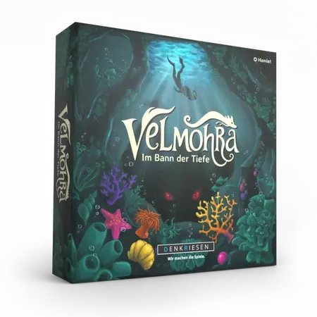 Velmohra findet an zwei Orten statt: auf dem Tauchplan, auf dem ihr über mehrere Runden hinweg Wege zeichnet und durch Ankreuzen Schätze sammelt, und in der Grotte, in der ihr mit eurer Taucherfigur auf die Suche nach Perlenchips geht. Durch beides werden unterschiedliche Effekte ausgelöst, die Punkte generieren. Wer die meisten Punkte hat, gewinnt!Das Spiel enthält alles, was ihr für eure Unterwasser-Expedition braucht: ein detailreich gestaltetes Grotten-Spielbrett, 1 Tauchplan-Block mit 50 Blättern, 4 Taucherfiguren, 4 Stifte sowie 50 Perlenchips (darunter 2 Jokerchips).Bei Velmohra taucht ihr Runde für Runde in die geheimnisvolle Grotte ab. Auf dem Tauchplan zeichnet ihr Wege, sammelt Schätze und löst Effekte aus. Mit eurer Taucherfigur bewegt ihr euch gleichzeitig durch die Grotte, um wertvolle Perlenchips zu bergen. Jede Entscheidung bringt euch Punkte – doch auch das Seeungeheuer kann euer Spielende einläuten. Wer am Ende die meisten Punkte gesammelt hat, gewinnt die Expedition.